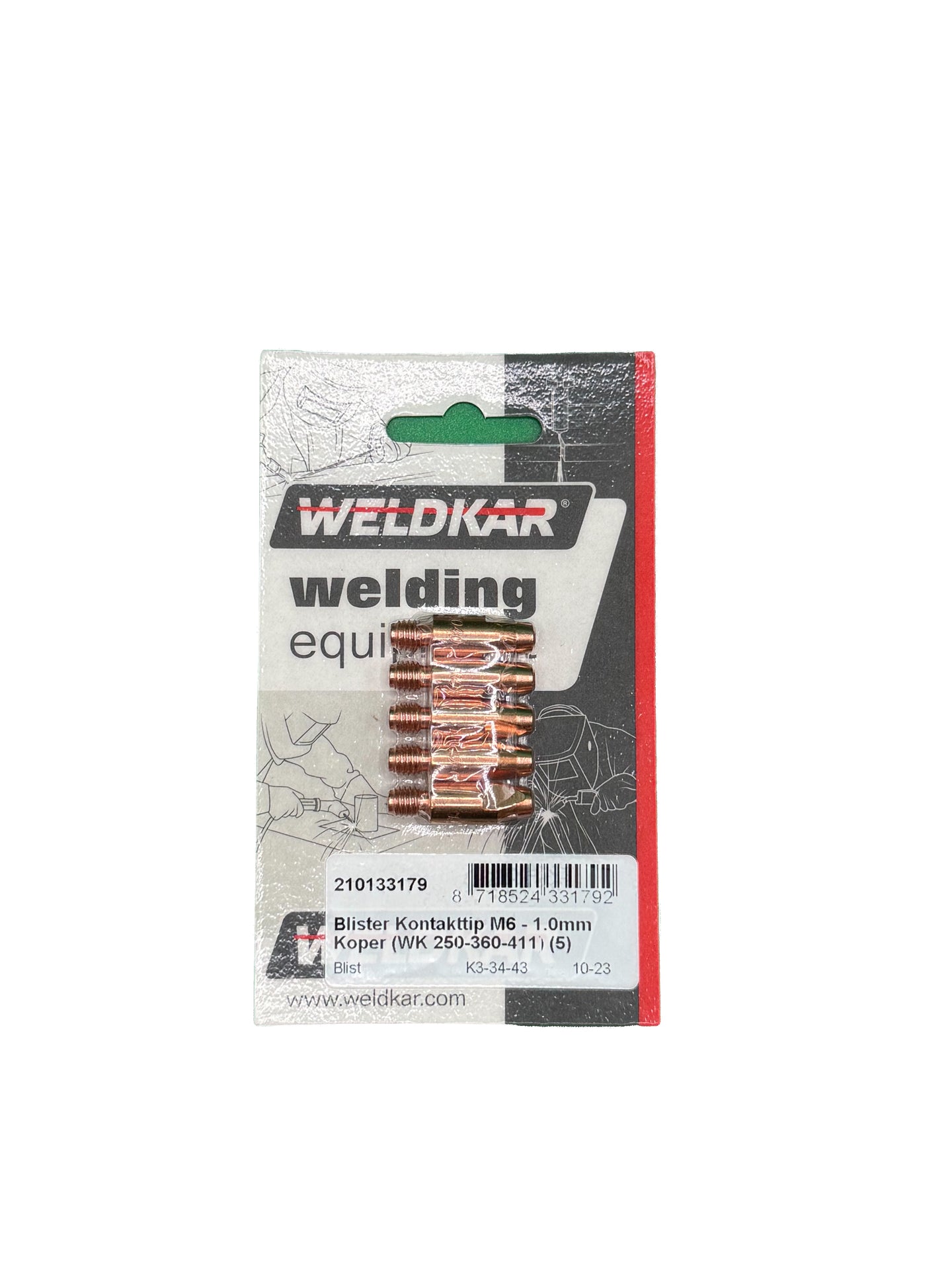 Voorzien van een M6 buitendraad, passend op de standaard contacttiphouders van Weldkar 250, 360 en 411 MIG-laspistolen. De stevige bevestiging zorgt voor een betrouwbare stroomgeleiding tijdens het lassen.