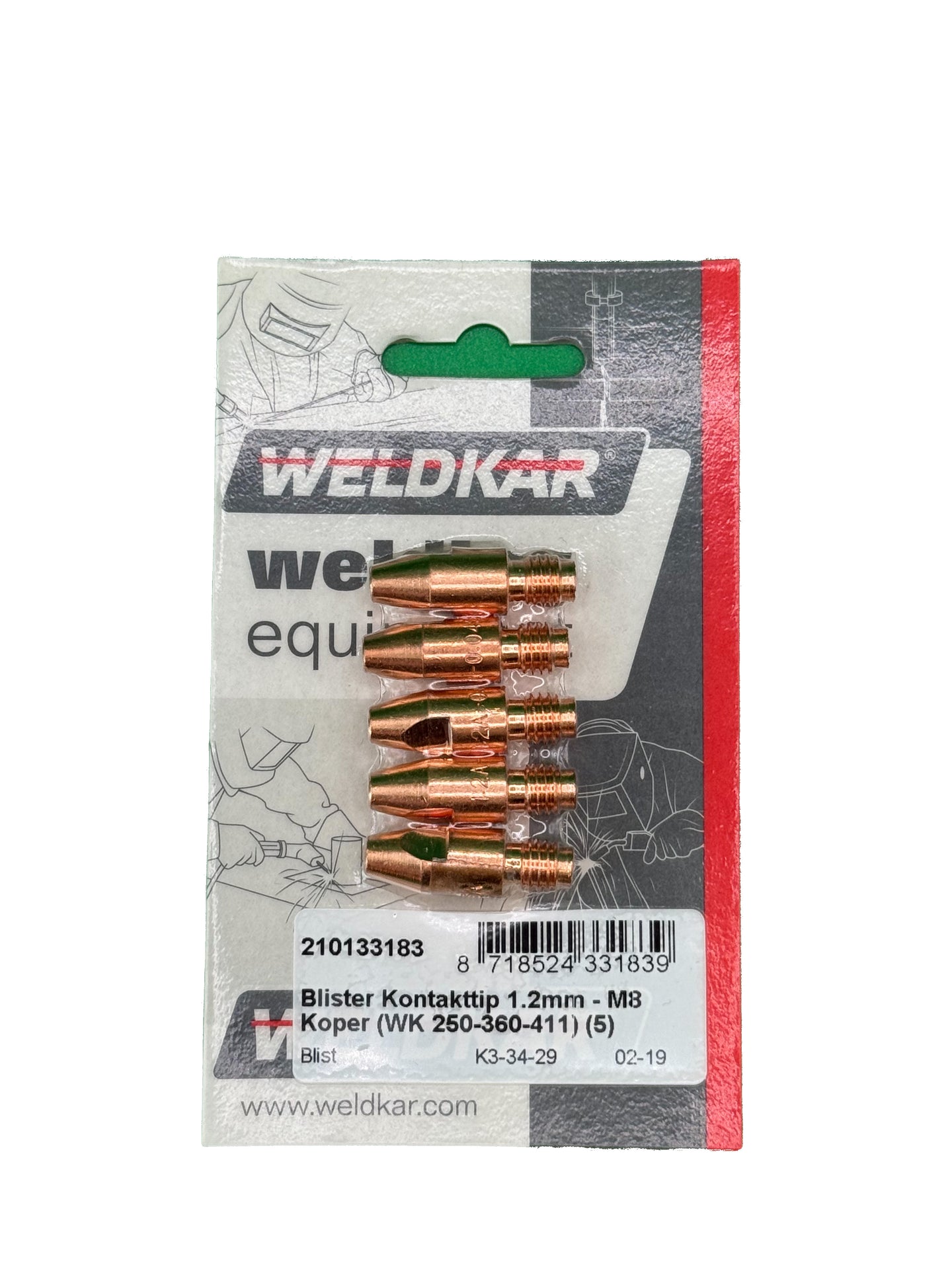 De tip is voorzien van M8 buitendraad, geschikt voor gebruik met de standaard tiphouders van Weldkar laspistolen type 250, 360 en 411. Dit garandeert een goede elektrische verbinding en stevige plaatsing in de toorts.