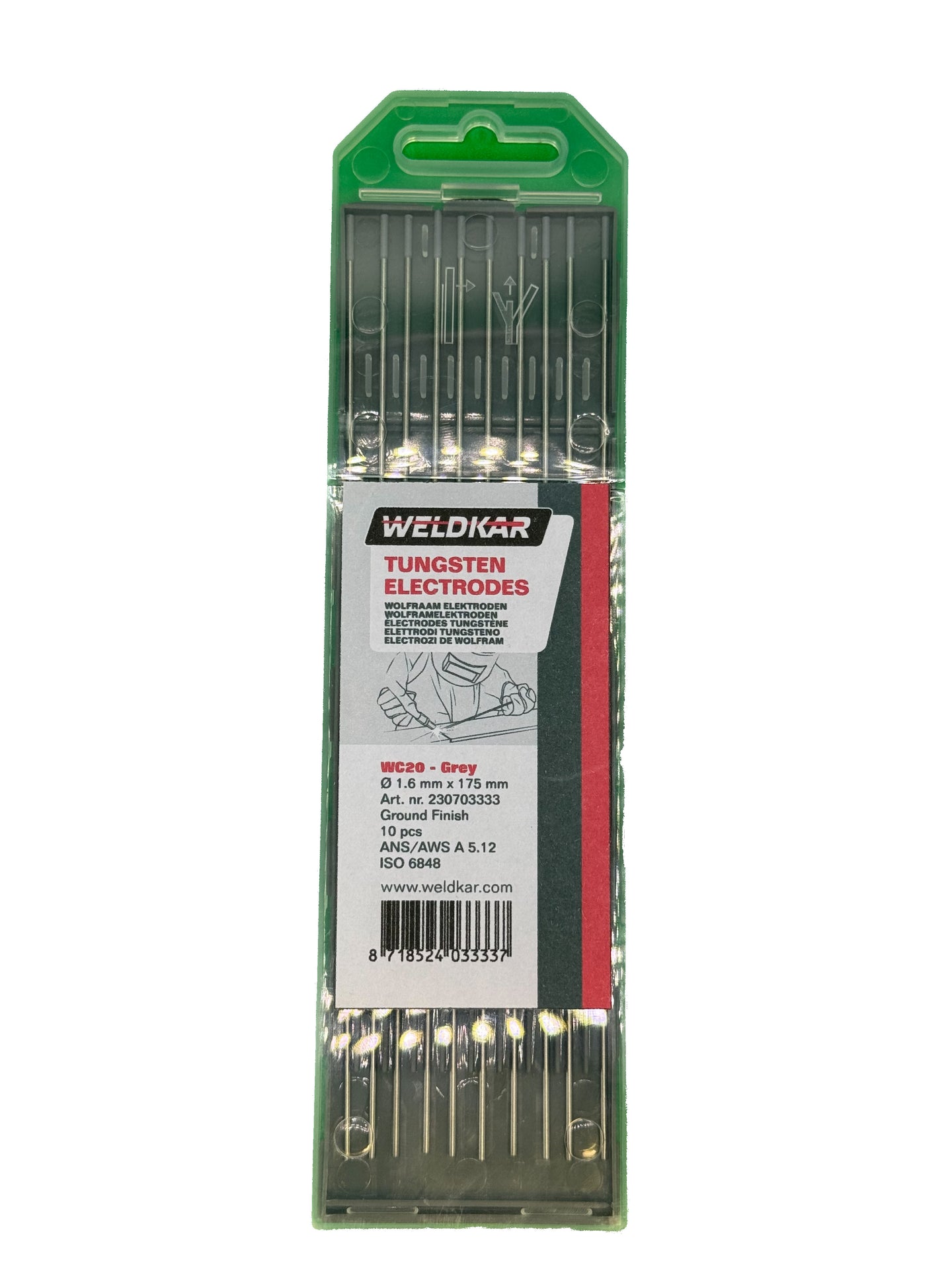 De grijze markering geeft aan dat deze elektroden zijn gemaakt van 98% zuiver wolfraam en 2% ceriumoxide. WC20-elektroden zijn een populair alternatief voor thoriumhoudende (rode) elektroden – zonder radioactieve eigenschappen, maar met vergelijkbare prestaties.